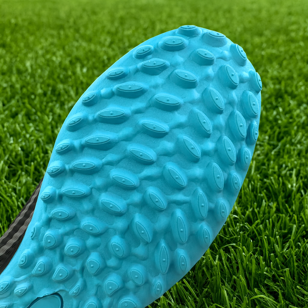 Los Teniguayo usan un patrón de tacos multidireccional diseñado específicamente para canchas sintéticas (F5, F7, sintético mojado o con caucho suelto).